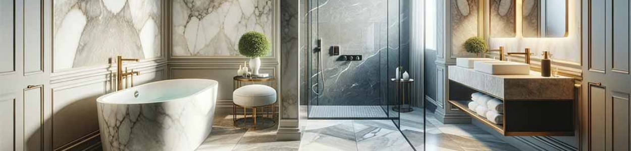 Designul băii cu ajutorul pietrei decorative poate evidenția frumusețea și durabilitatea diferitelor tipuri de piatră, de la marmură și travertin, la granit și onix. Aceste materiale sunt ideale pentru o varietate de elemente de design, de la podele și până la placarea peretilor și chiuvete.